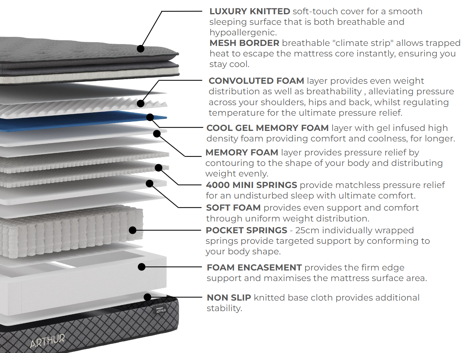 Layers of high-density Memory and Gel foams rest above and below layers of mini and pocket springs, providing superior support, durability, and pressure relief. This helps to maintain proper spinal alignment and extend the mattress's lifespan.The memory foam layers provide the all-important sink-in comfort you’ve always dreamed of. They also pave the way for body-cradling support and cosy comfort. Finally, the convoluted foam enhances airflow for better temperature regulation, offers targeted pressure relief, and adds a layer of cushioning comfort to the mattress.