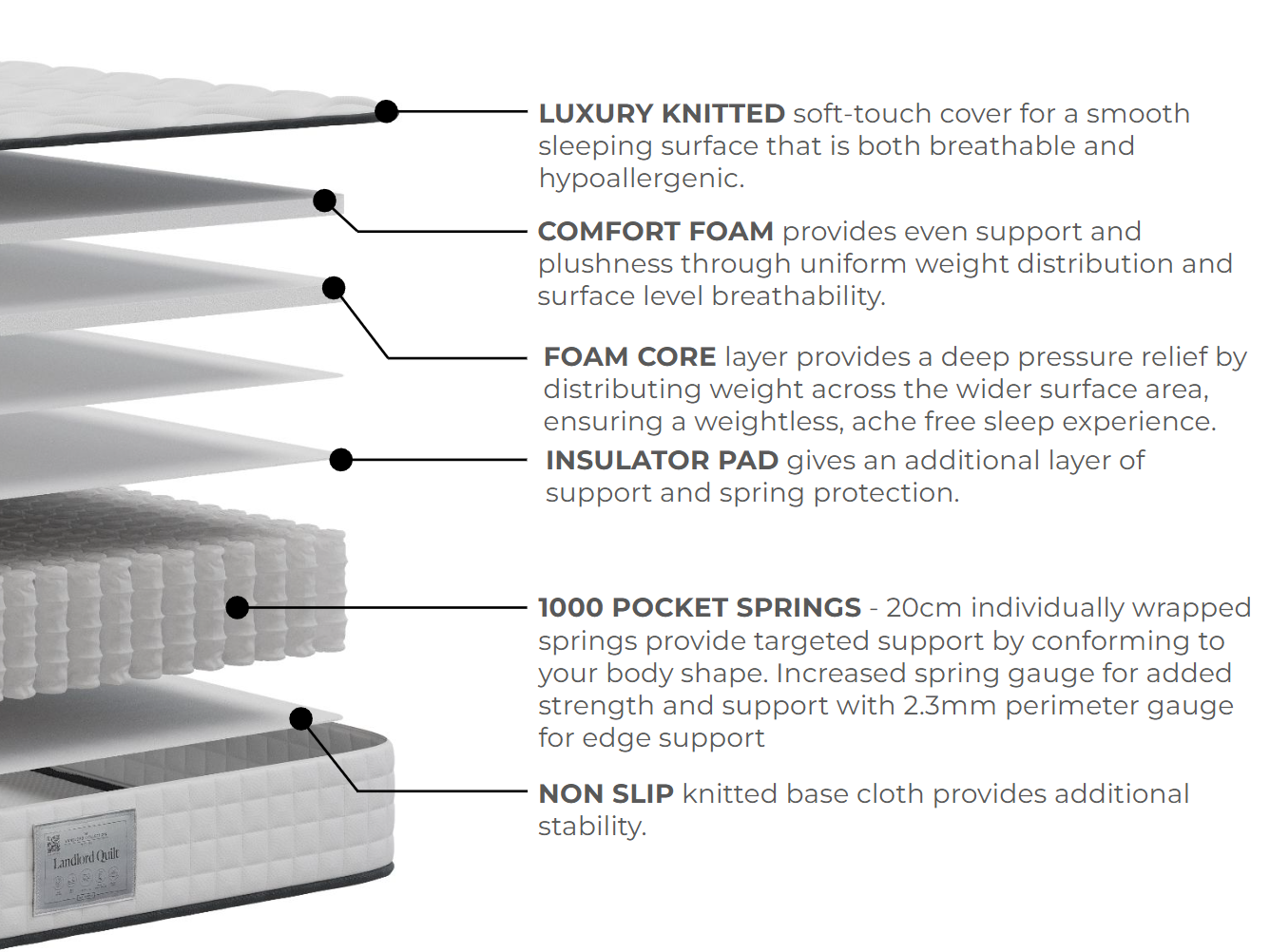 Complementing the high-tensile spring core, sumptuous foam layers provide body-moulding properties that adapt to your unique silhouette for immediate pressure relief. This soft foam body ensures you can sink into incredible comfort, while the integrated microfiber layers create the breathable, cloud-like sleep experience expected from a premium mattress. By combining these adaptive materials, the Landlord Quilt achieves a perfect balance between deep structural support and a luxurious, cushioned feel.