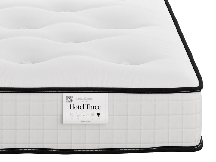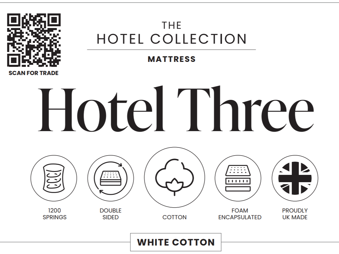 The Hotel Three Pocket comes to you with 1200 pocket springs and luxury hypo allergenic fillings giving your guests the perfect stay. A source 5 cover sees that the product covers all legislations to perfectly sit within your establishment. Guests will come back for more, just to sleep on this mattress. For quantity order call our Contracts team for a quotation on 0800 567 7625.