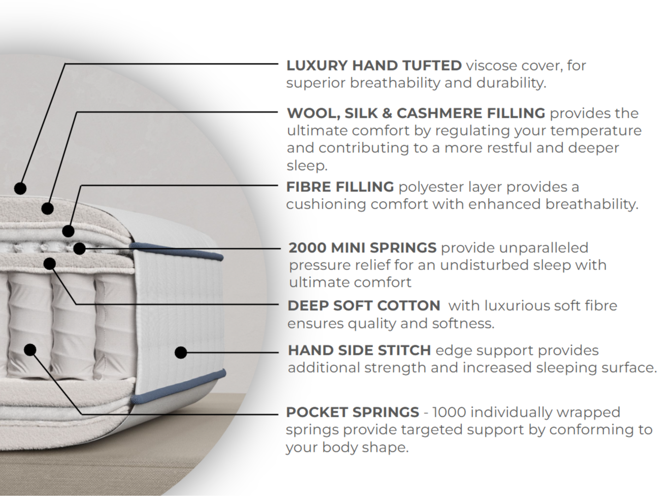The mattress is hand-tufted, a traditional technique that secures the luxurious fillings in place.