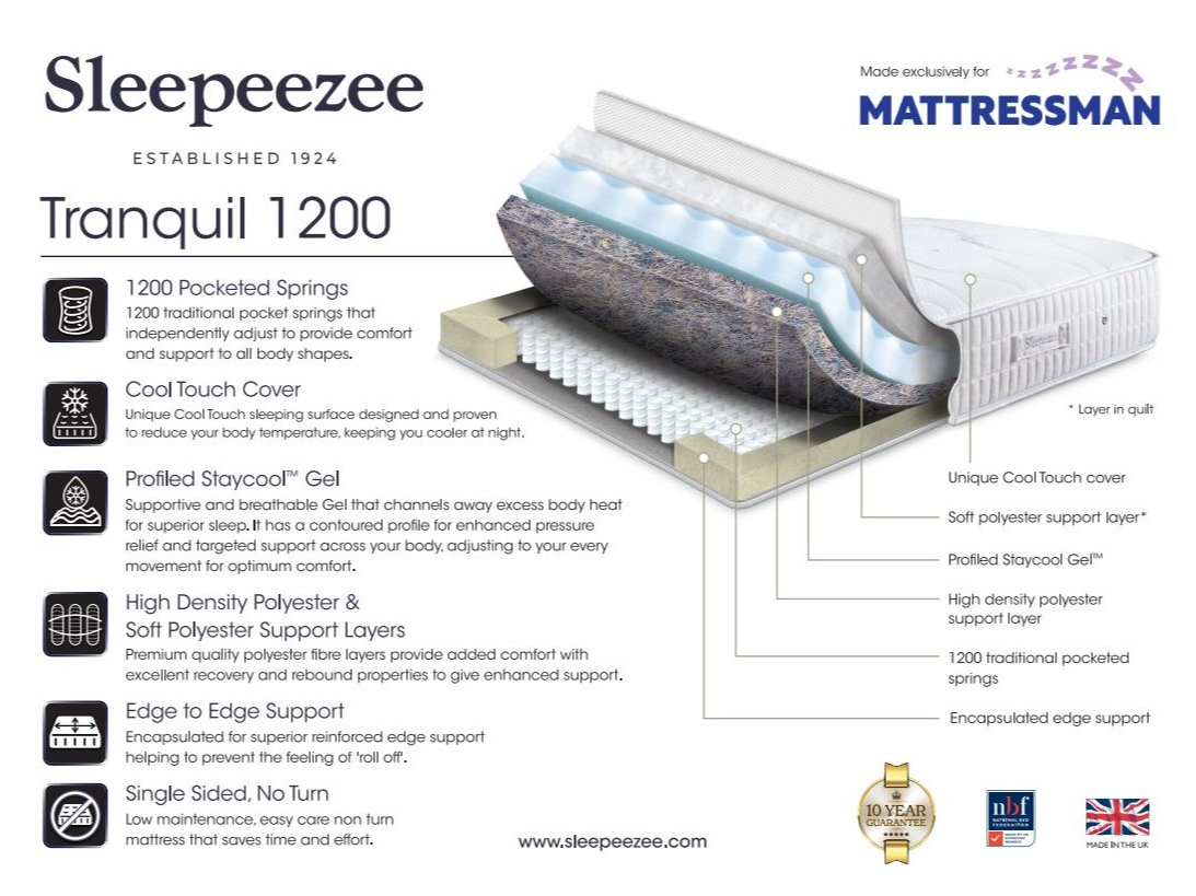Stay cooler and supported all night with the Sleepeezee Tranquil 1200 Mattress, designed exclusively for Mattressman. Featuring 1,200 traditional pocket springs, this mattress adapts to your body for ...