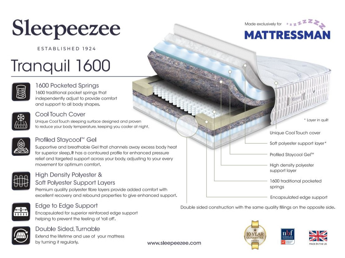 Enjoy enhanced support and extended mattress life with the Sleepeezee Tranquil 1600 Mattress, designed exclusively for Mattressman. Featuring 1,600 traditional pocket springs, this mattress provides ...